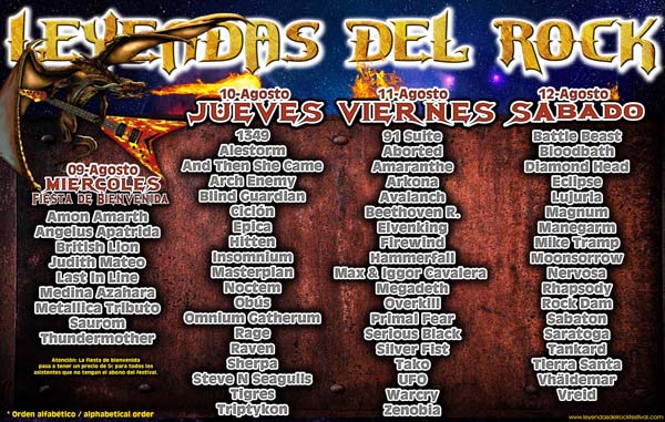 El cartel esta formado por Megadeth, Sabaton, Blind Guardian, Amon Amarth, Arch Enemy, Ufo, Magnum, Rhapsody, Hammerfall, Overkill, Epica, Primal Fear, Rage, Warcry, Max & Iggor Cavalera Return to Roots, Steve Harris British Lion, Last In Line, Battle Beast, Mike Tramp White Lion, Tankard, Silver Fist, Obús, Medina Azahara, Avalanch, Saurom, Tierra Santa, Saratoga, Angelus Apatrida, Lujuria, Firewind, Vreid, Masterplan, Triptycon, Bloodbath, Amaranthe, Eclipse, Raven, Moonsorrow, Diamond Head, Aborted, Alestorm, Manegarm, Arkona, Omnium Gatherum, Elvenking, Serious Black, 1349, Zenobia, Sherpa, Beethoven R., Vhäldemar, Thundermother, Insomnium, Noctem, Nervosa, And Then She Came, Tako, Tigres, Rock Dam, Steve 'N' Seagulls, 91 Suite, Ciclón, Hitten y Metallica Tributo.