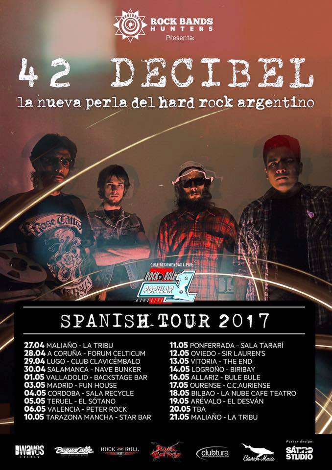 Los rockeros argentinos 42 Decibel, llegan a Allariz, Ourense y Ponteareas dentro de su gira española en la que realizan un total de 20 conciertos en las cuatro semanas que estarán entre nosotros. El pasado año 2016 nos visitaron por primera vez como banda y realizaron algunos conciertos durante el mes de julio. Visitaron Madrid, Valencia, Ourense, Vigo y Cantabria.
