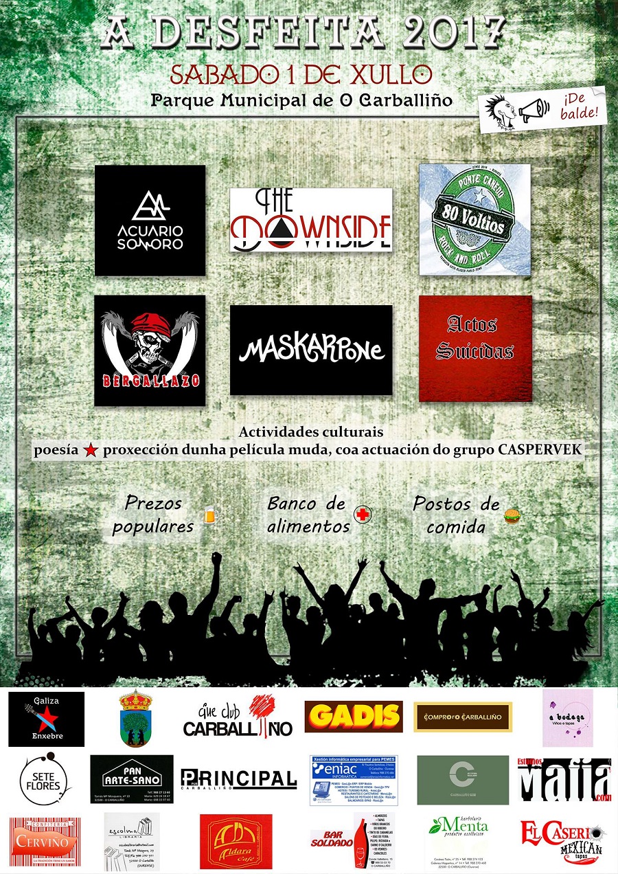 El próximo 01 de julio se celebra una nueva edición del A Desfeita en O Carballiño. Bergallazo, Maskarpone, 80 Voltios, Acuario Sonoro, Actos suicidas y Downside serán las seis bandas en poner la nota musical a la edición 2017.